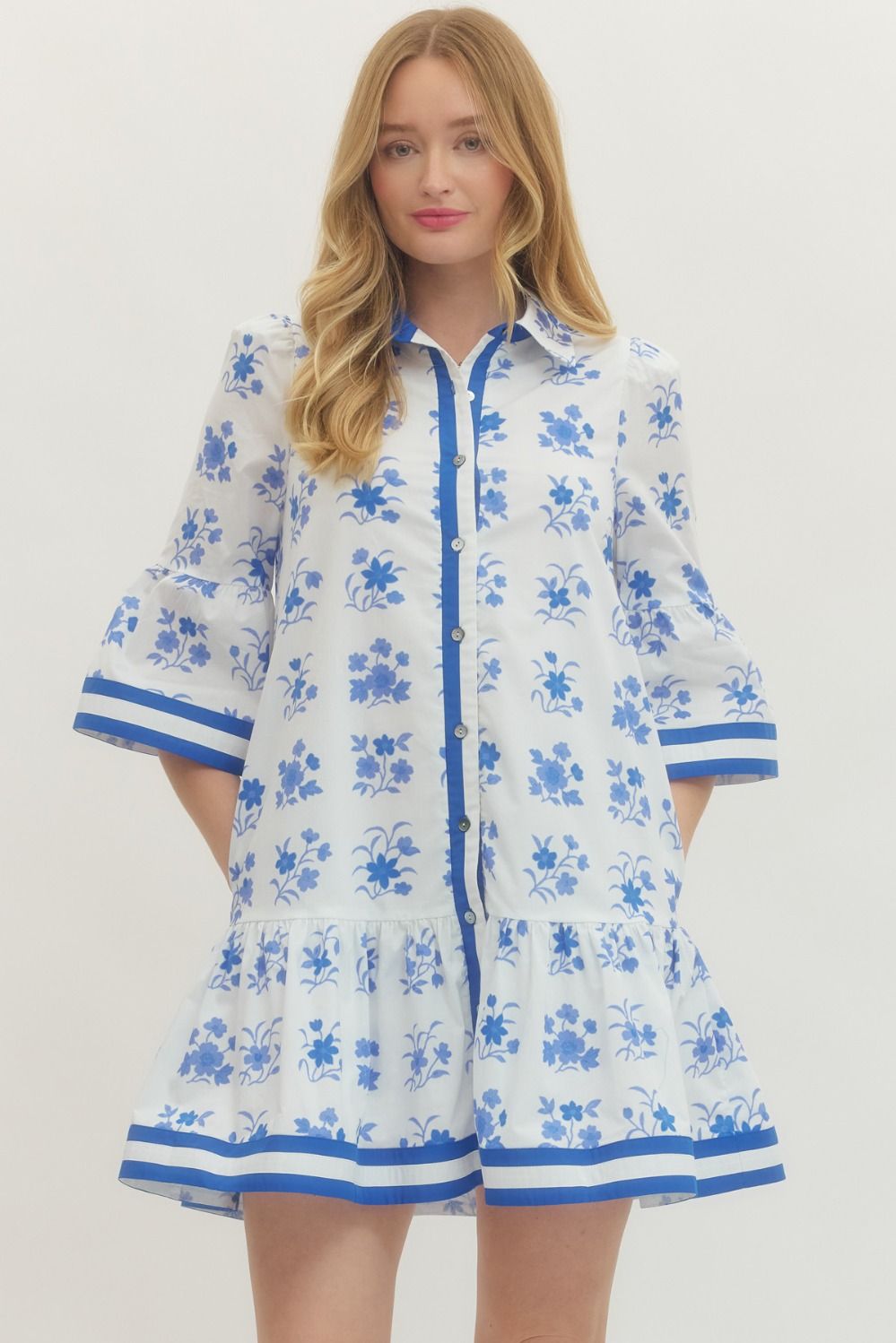 Solid floral print short sleeve mini dress featuring button closure at front. Ruffle hem. Side pockets. Lined. Woven. Non-sheer. Lightweight.