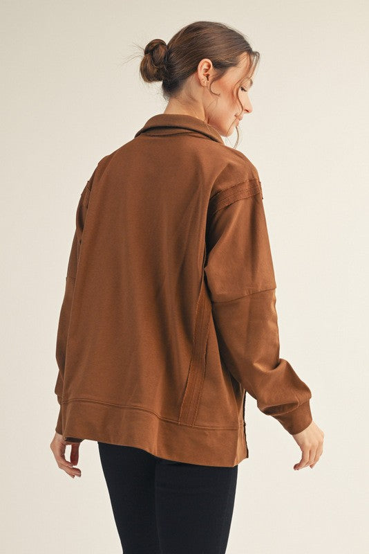 Drop shoulder slit detail solid top with raw cut accent, button up high neck.