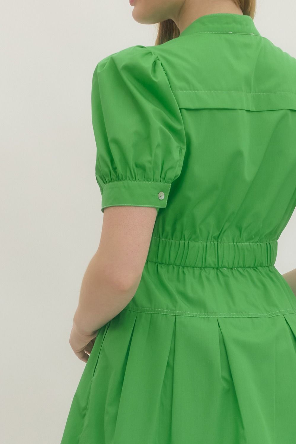 Solid short puff sleeve mini dress featuring split V-neck with band collar and button closure at front. Chest patch pocket. Elasticated waist detail. Buttoned sleeve cuffs. Side pockets. Lined. Woven. Non-sheer. Lightweight.