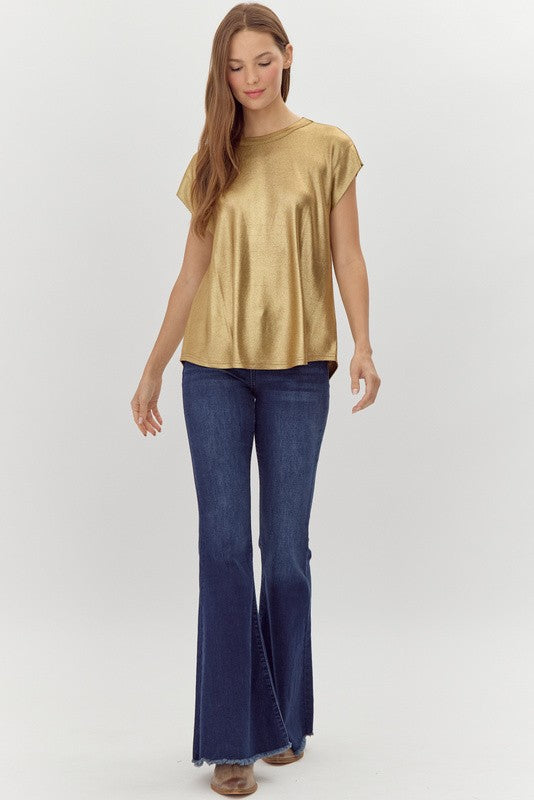 Laminated jersey top with crew neckline, and short sleeves. - Non-sheer, lightweight. - Model is 5'10'' and is wearing a Small.