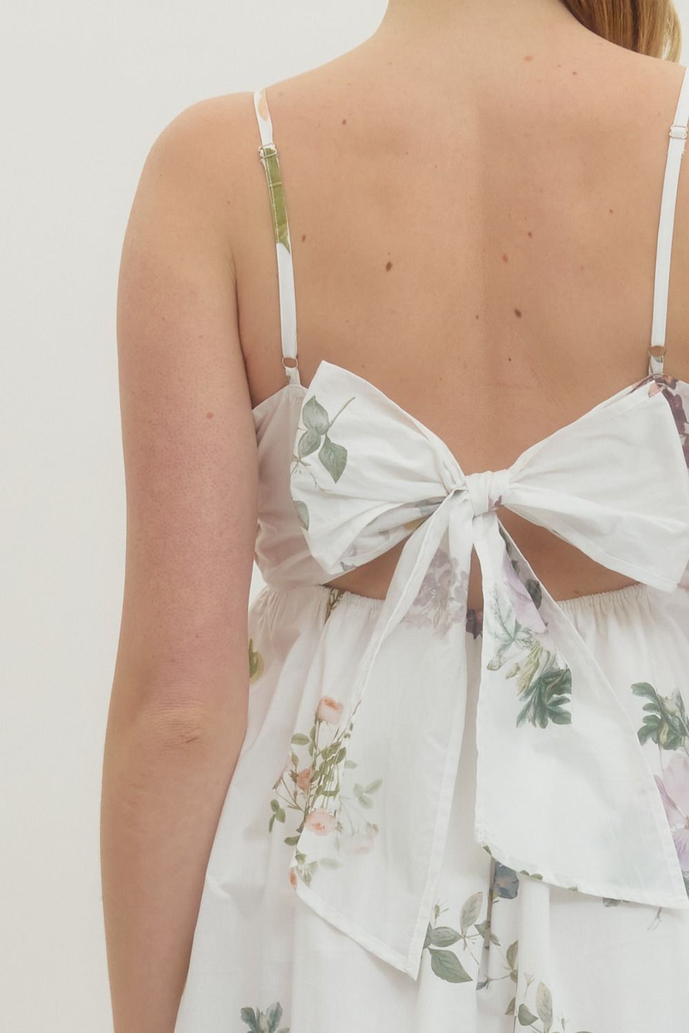 Floral print sleeveless midi dress featuring scallop neckline and bow tie detail at back. Side pockets. Lined. Woven. Non-sheer. Lightweight.