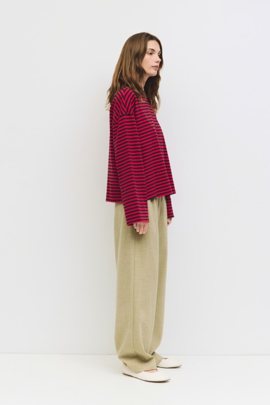 The Callahan Top is a relaxed-fit long-sleeved tee made from midweight striped fabric. It features a solid color crewneck and drop shoulders for a casual, comfortable look. A versatile essential for layering or wearing on its own.