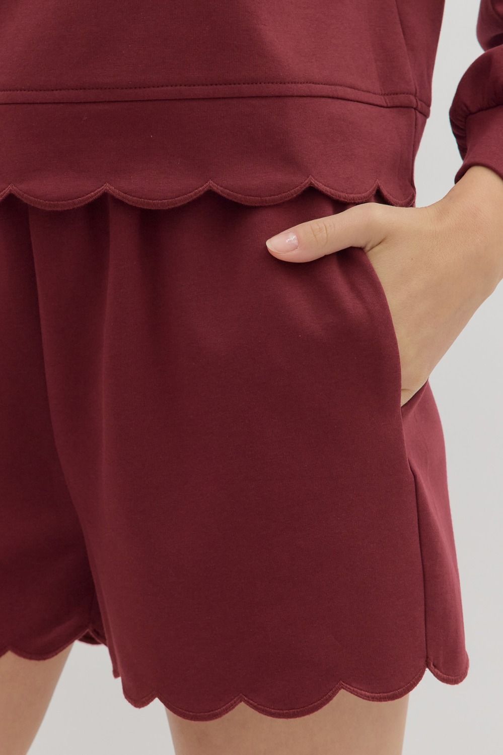 Solid high-waist pull-on shorts featuring embroidered scallop edge finish. Drawstring adjustable elasticated waistband. Side pockets. Unlined. Knit. Non-sheer. Lightweight.