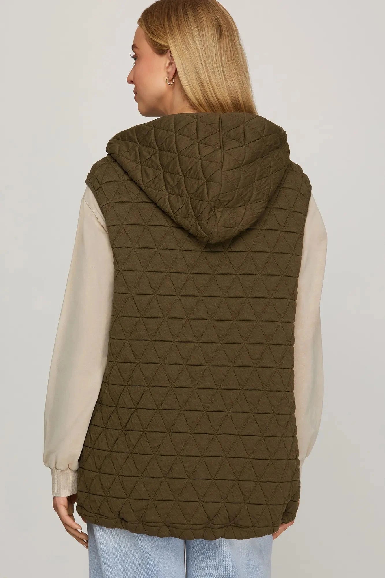 Zip Up Hooded Quilt Vest With Front Pocket And Drawstring Hem