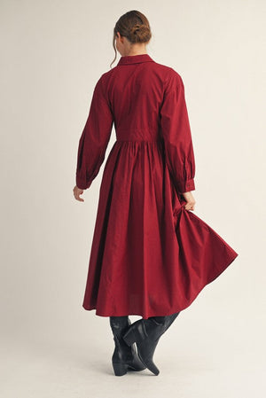 Long sleeves button down midi dress with side pockets, waist tie, front pleat accent.