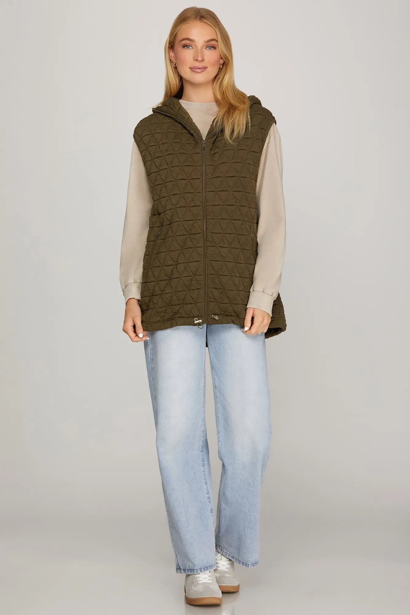 Zip Up Hooded Quilt Vest With Front Pocket And Drawstring Hem