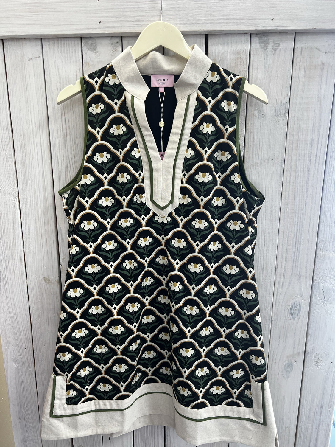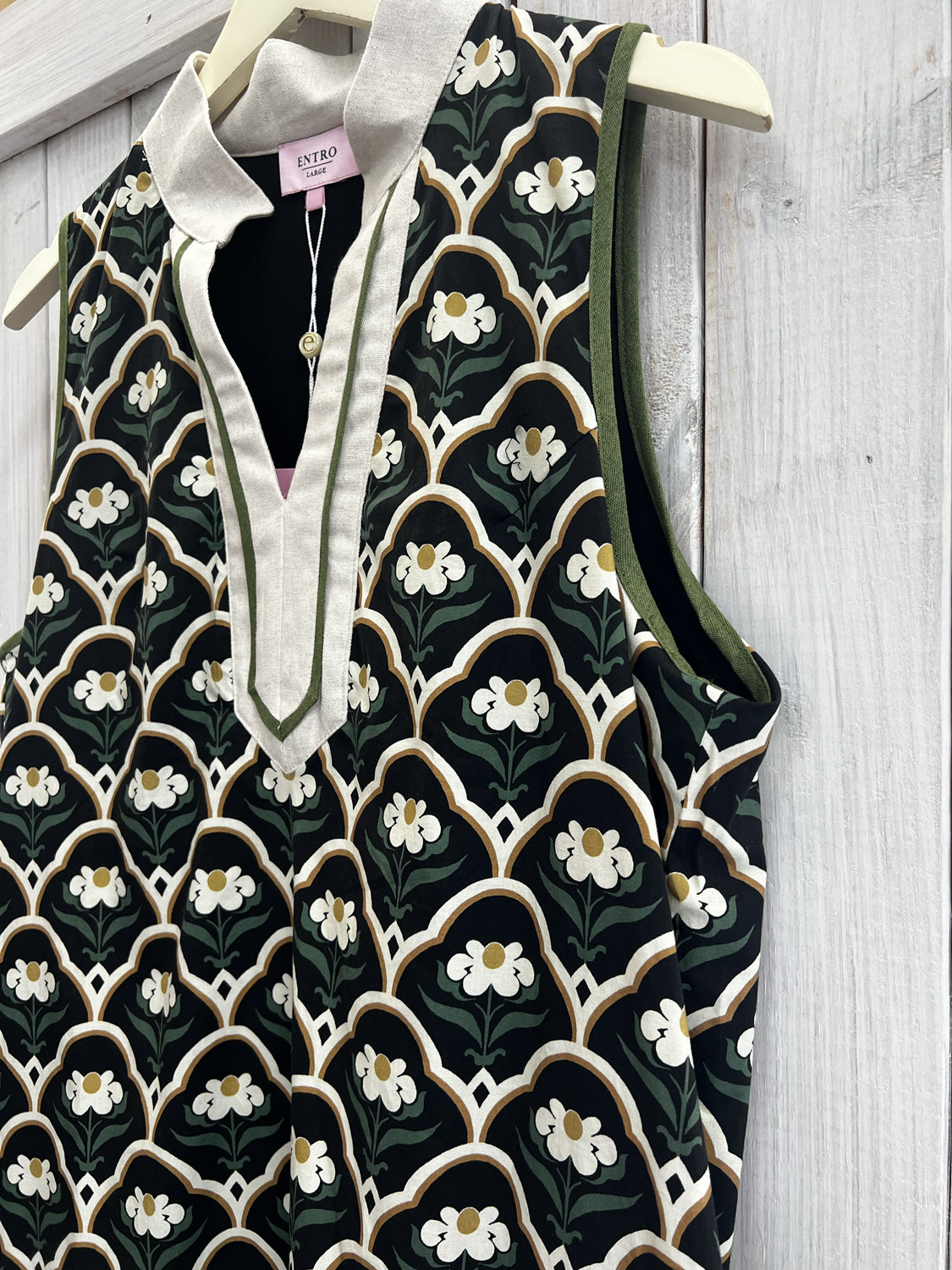 Floral scallop motif print sleeveless caftan-inspire high neck band collar pullover mini dress featuring accented border finish slit hem. Lined. Woven. Non-sheer. Lightweight. Fabric Content 97%COTTON 3%SPANDEX