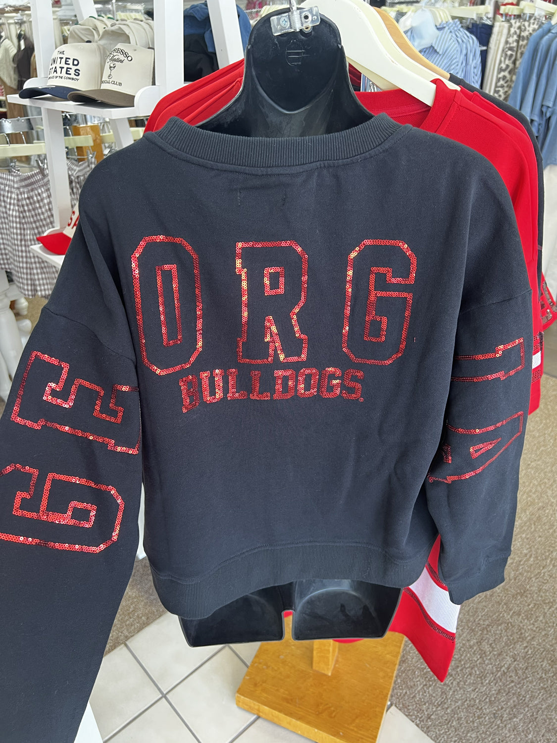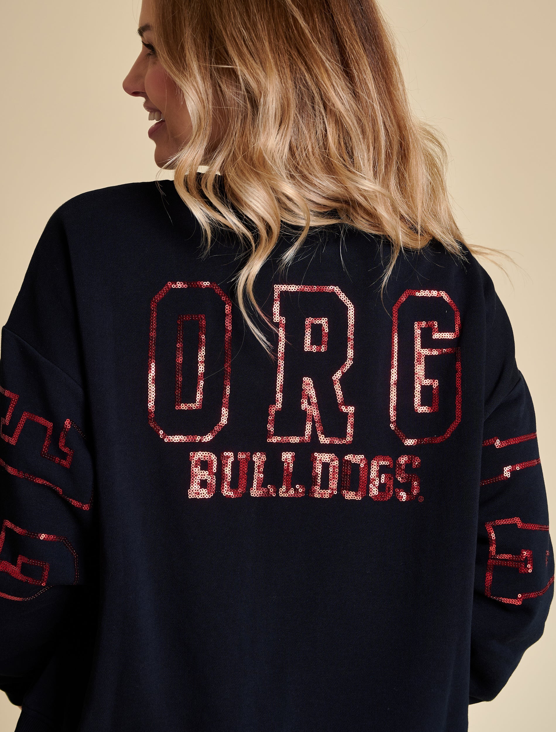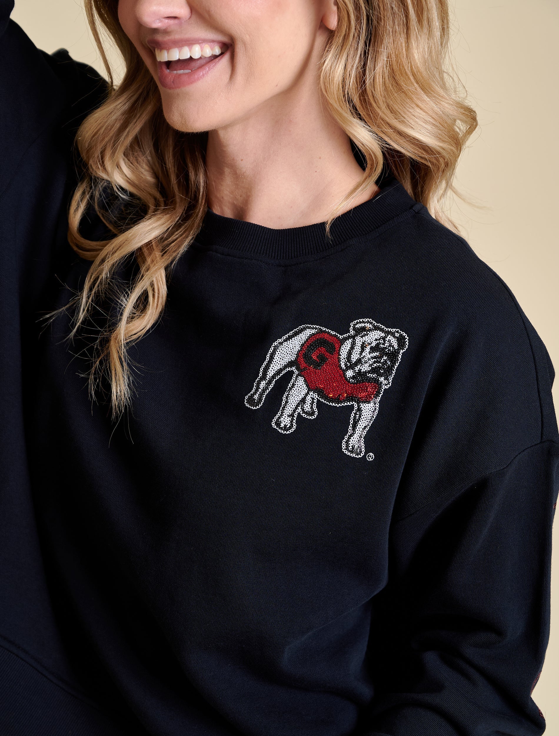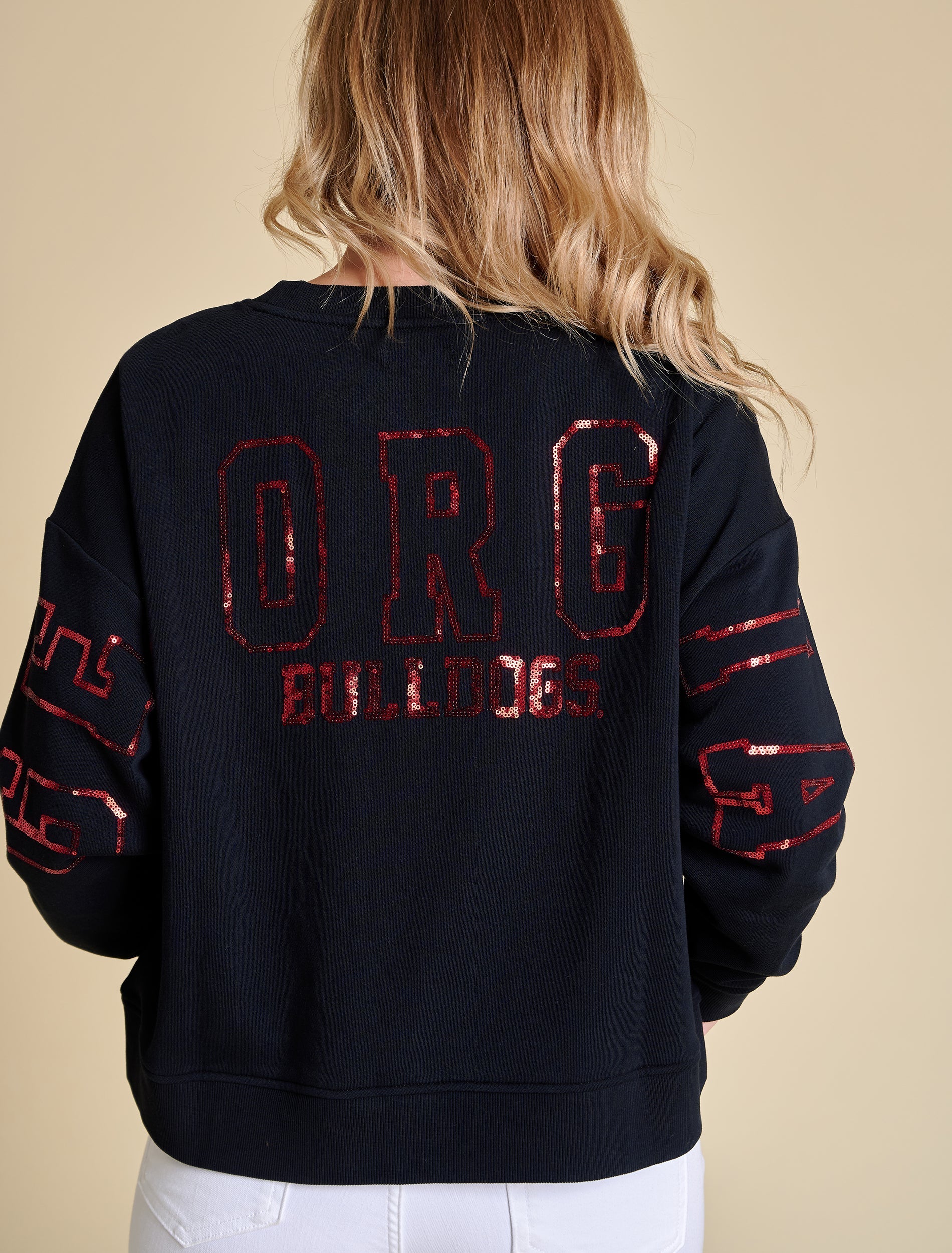 This oversized crewneck sweatshirt updates a familiar shape with sequin logos at the back and chest, delivering a subtle but eye-catching shimmer. The soft fleece fabric ensures all-day comfort, while the boxy fit adds modern volume. Style with leather leggings and boots for an elevated casual cool.