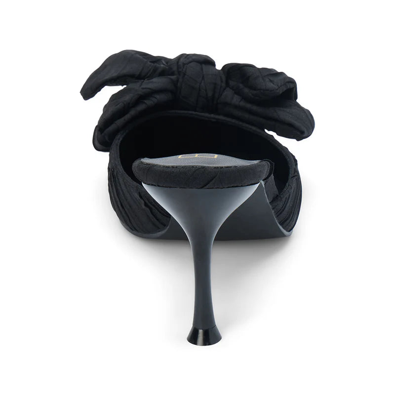 Vegan pointed-toe mule with sculpted heel and oversized knotted bow.