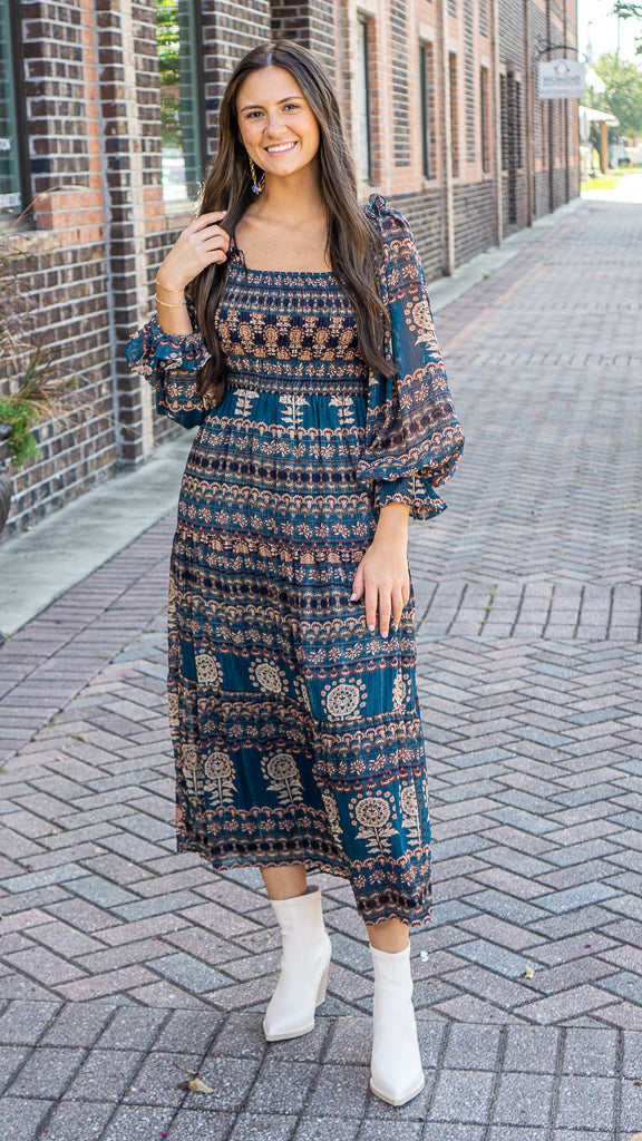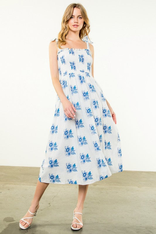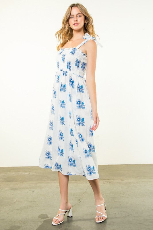 Bow Tie Strap Floral Smocked Organza Midi Dress
