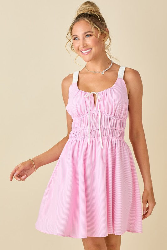 Sleeveless Tie Strap Textured Woven Midi Tiered Dress With Pockets And Full Lining