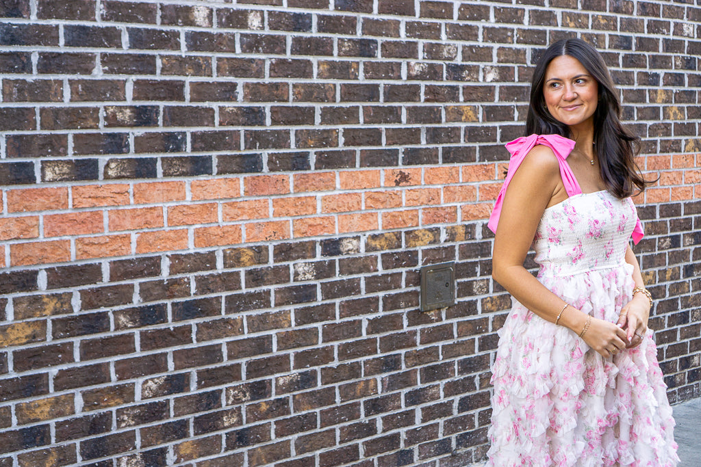 Product Name: Bow Tie Strap With Floral Printed Smocking Top With Ruffle Detailed Flared Organza Midi Dress