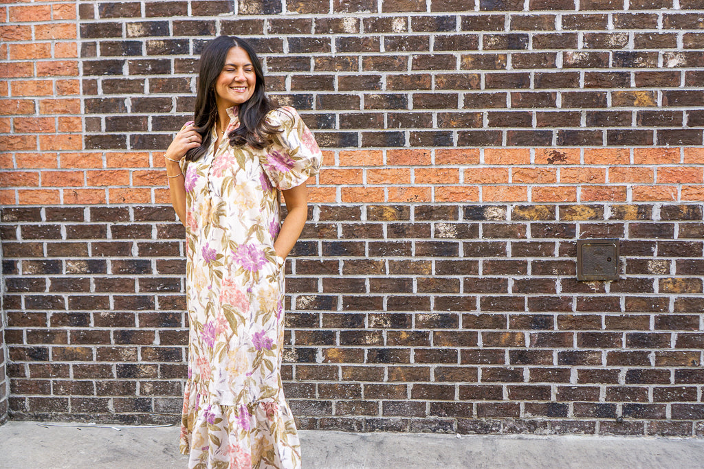 Floral print ruffled neck short puff sleeve midi dress featuring button closure at front. Ruffle hem. Side pockets. Lined. Woven. Non-sheer. Lightweight.