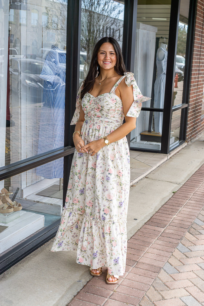 Floral Cotton Print Ruched Bodice Shoulder Tie Lined Midi Dress