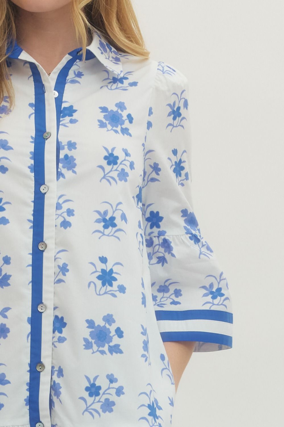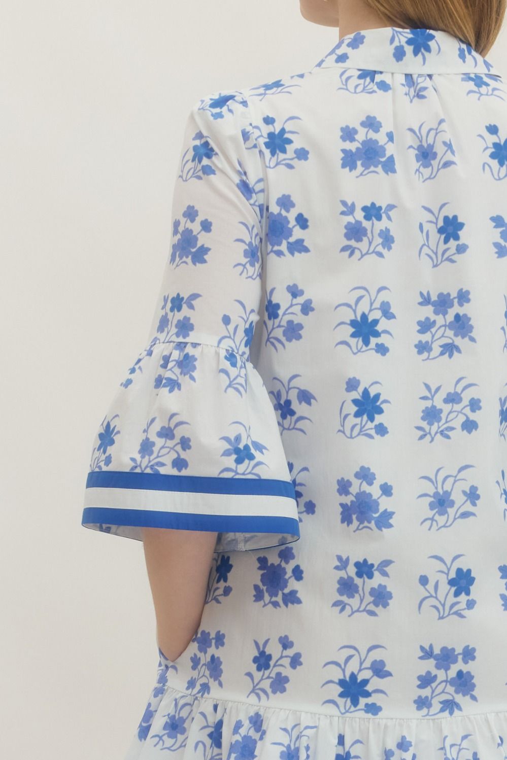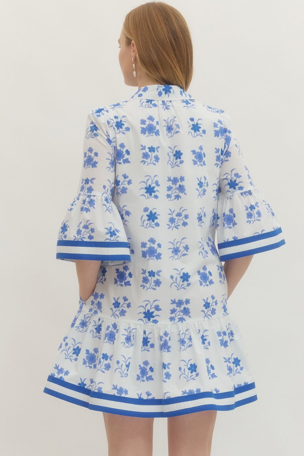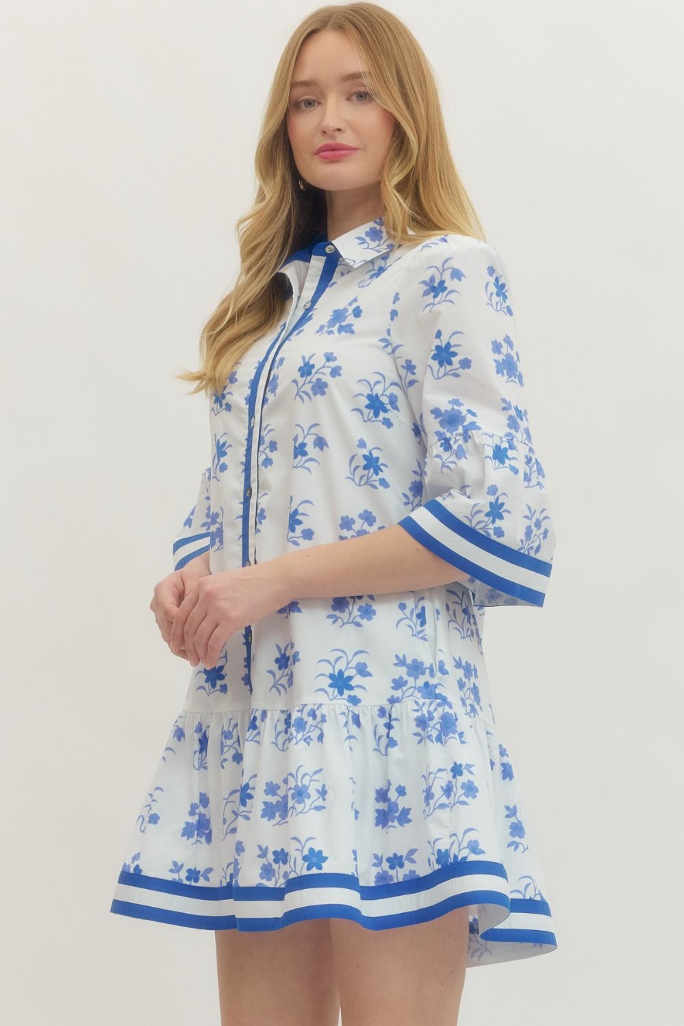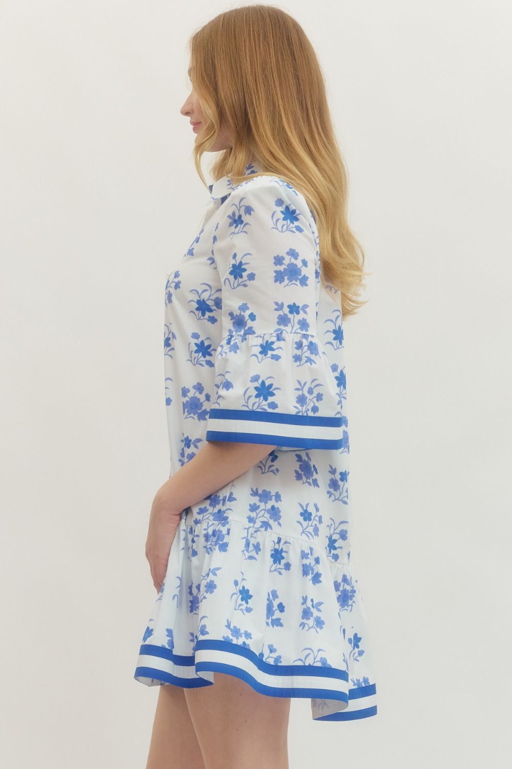 Solid floral print short sleeve mini dress featuring button closure at front. Ruffle hem. Side pockets. Lined. Woven. Non-sheer. Lightweight.