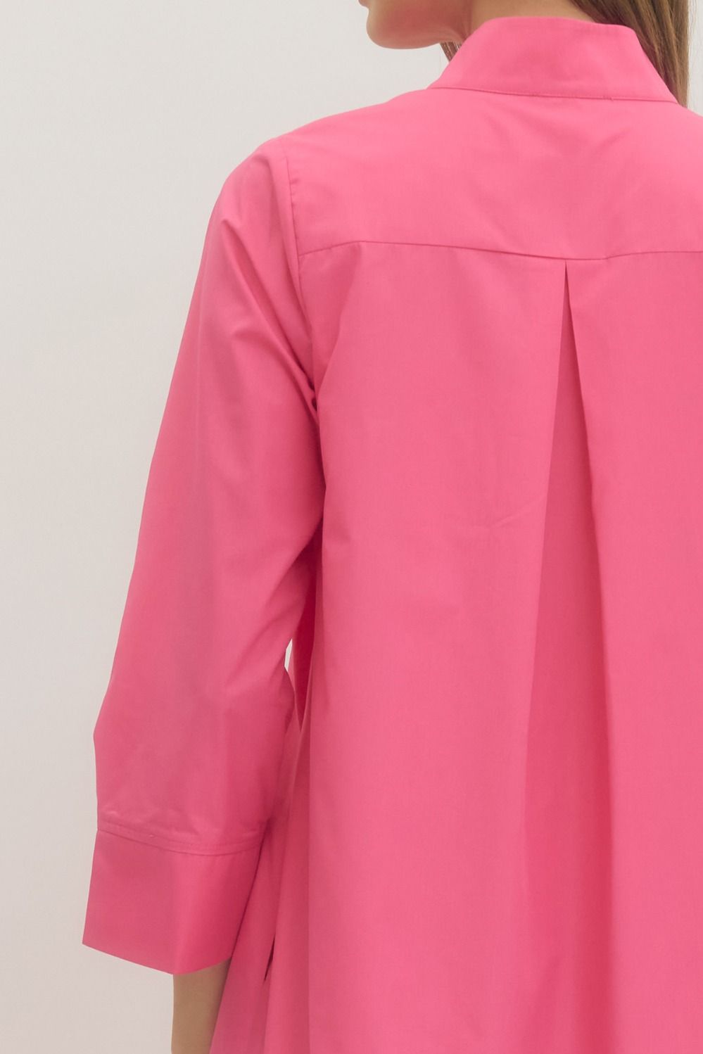 Solid long sleeve midi dress featuring button closure at front. Side pockets. Lined. Woven. Non-sheer. Lightweight.