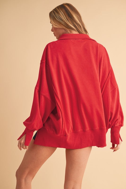 This bold oversized Tamika henley pullover features snap details at the neckline and a relaxed silhouette for effortless athleisure vibes. Perfect for layering over biker shorts or leggings, it's the ultimate blend of sporty and cozy chic.